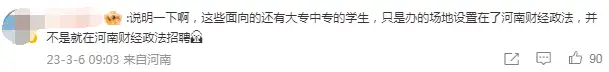 而此次引发关注的招聘会,其实是“2023‘郑’聚英才职等你来”郑州市人才招聘进校园活动的首场。河南财经政法大学官网信息显示,参加招聘会的用人单位近500家,提供岗位1.6万个,其中不乏中铁工程装备集团、中国化学工程集团、河南众驰富联精工科技、河南天筑大数据研究院等单位,吸引了省内外20余所院校10000余名毕业生到场参会。此外,社会人员也正常入校参加招聘活动。