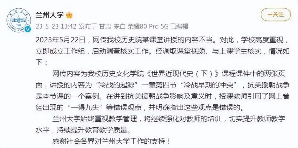 23日,@兰州大学回应称,网传内容为我校历史文化学院《世界近现代史(下)》课程课件中的两张页面,讲授的内容为“冷战的起源”一章第四节“冷战早期的冲突”,抗美援朝战争是本节课的一个案例。在讲到抗美援朝战争影响及意义时,授课教师引用了网上曾经出现的“一得九失”等错误观点,并明确指出这些观点是错误的。