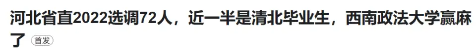 河北公布了2023年定向选调录用的898人名单,其中清华大学和北京大学分别排在了第一和第二名,基本上都去了省直和石家庄市直、雄安新区等地!而河北工业大学仅9人,还比不上河北农业大学、河北大学等省内普通双非院校,河工大真的惨,虽然是天津和河北共建的211高校,结果两个省份都不爱河工大毕业生!