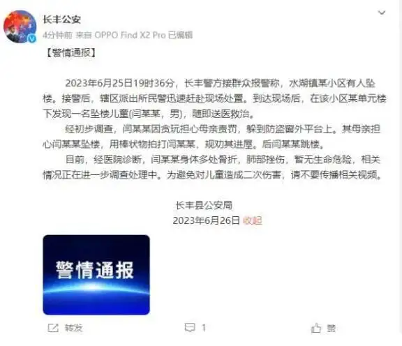就网传“家长追打孩子导致其坠楼”一事,安徽合肥市长丰县公安局官方微博6月26日晚间通报称,经初步调查,坠楼男孩闫某某因贪玩担心母亲责罚,躲到防盗窗外平台上。其母亲担心闫某某坠楼,用棒状物拍打闫某某,规劝其进屋。后闫某某跳楼。坠楼男孩多处骨折,肺部挫伤,暂无生命危险。相关情况正在进一步调查处理中。