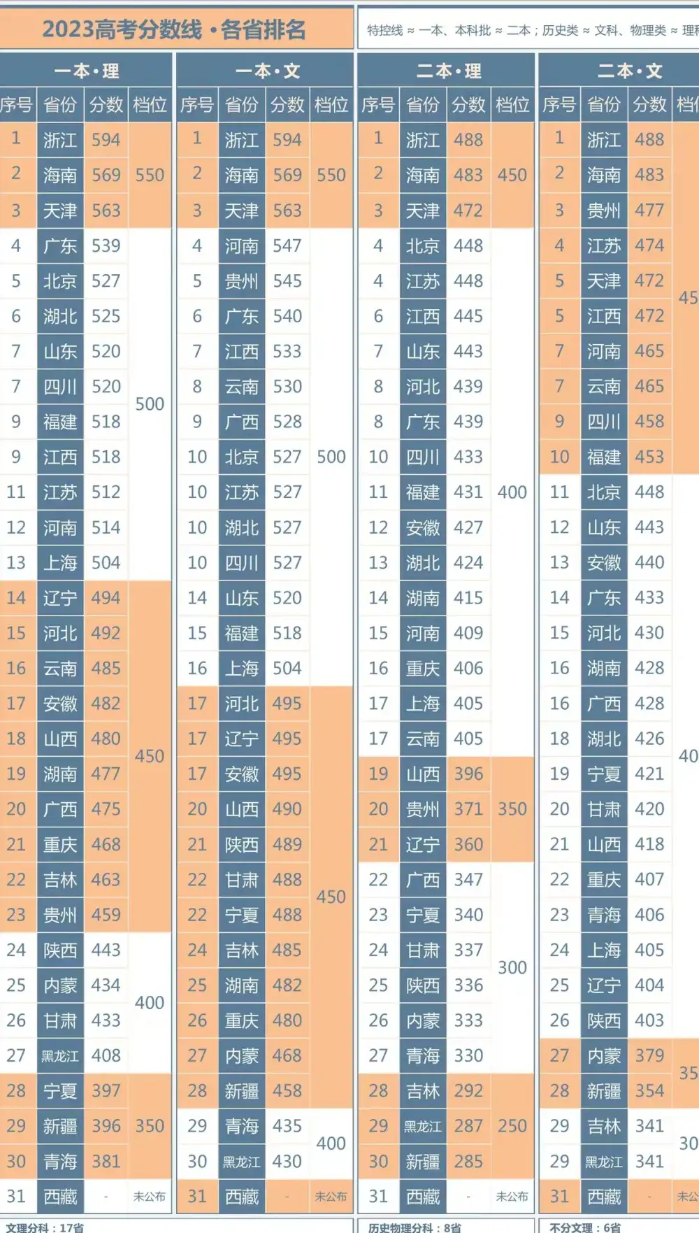 随着6月26日,西藏自治区招生考试委员会办公室发布《西藏自治区2023年普通高等学校招生录取最低控制分数线》公告,2023年全国内地31个省、市、自治区各层次、各段录取分数线全部浮出水面。
