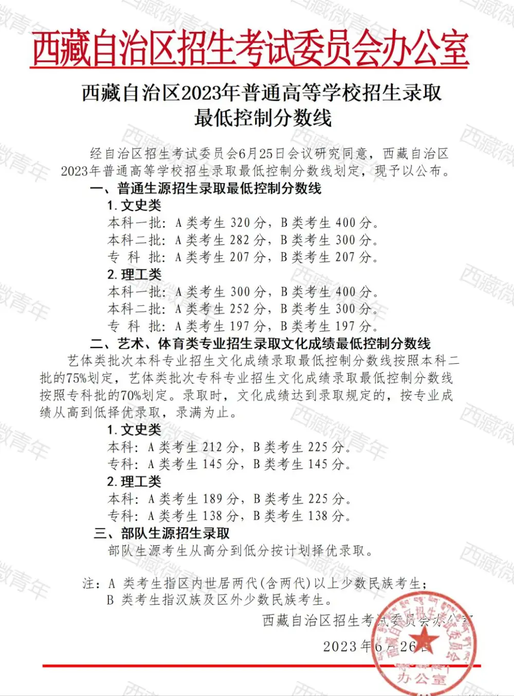 其中,西藏自治区2023年高考文史类本科第一批最低录取分数线是:A类考生320分,B类考生400分。