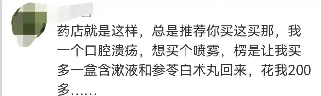 值得一提的是,多名网友表示,目前药店推销药品已成普遍现象,“药店去买药就给你介绍二三百的”“药店总是推荐你买这买那,一个口腔溃疡,想买个喷雾,愣是让我买多一盒含漱液和参苓白术丸回来,花我200多……”