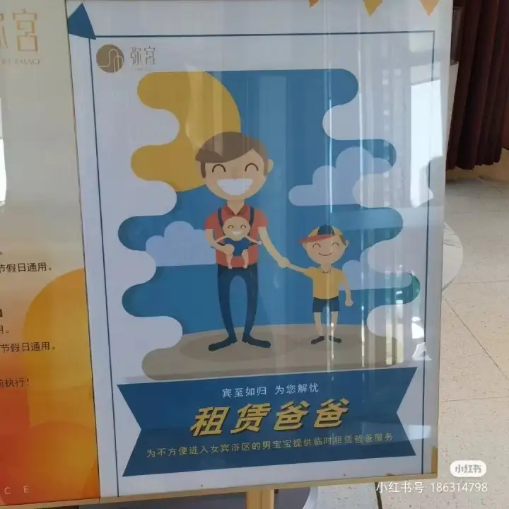 6月26日晚,网友“绿绿绿子”分享了一张自己在沈阳一家洗浴中心看到的温馨服务——“为不方便进入女宾浴区的男宝宝提供临时租赁爸爸服务。”