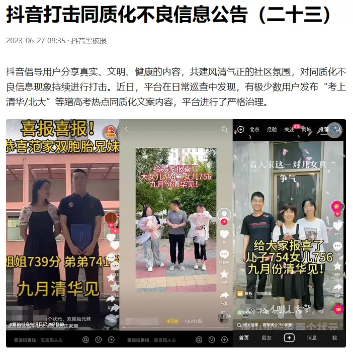 据抖音黑板报公告,平台近期在日常巡查中发现,有极少数用户发布“考上清华 / 北大”等蹭高考热点同质化文案内容,平台进行了严格治理。其中,有“清 **”“用 **3”“花 ** 心”等用户,不当蹭热高考分数等内容,采用“报喜”等同质化话术,发布视频称“儿女高考成绩双双 7xx 分,9 月清华 / 北大见”。
