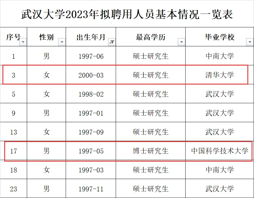 武汉大学公布了2023年录用的32名辅导员名单,其中有11人都是武汉大学本校硕士博士毕业生,而华科也稳定有3人,不过省内其他高校录取人数则锐减,仅仅只有武汉理工大学有1人被录取!同时录取人员中有一名2000年出生,现在23岁就毕业的清华硕士,还有一名26岁毕业的中科大博士毕业,真的卧虎藏龙啊!