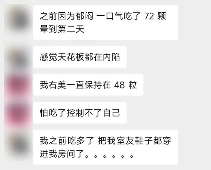 药物滥用的结果是药物成瘾,随之而来的是药量的大幅增加。在一个药物滥用群中,有用户说,“因为郁闷一口气吃了72颗”;另一名用户表示,“自己吃右美沙芬的量一直保持在48粒”。