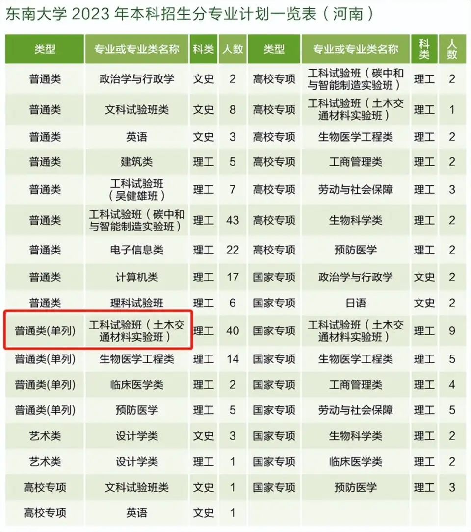 数据二:2023年东南大学在河南的招生计划