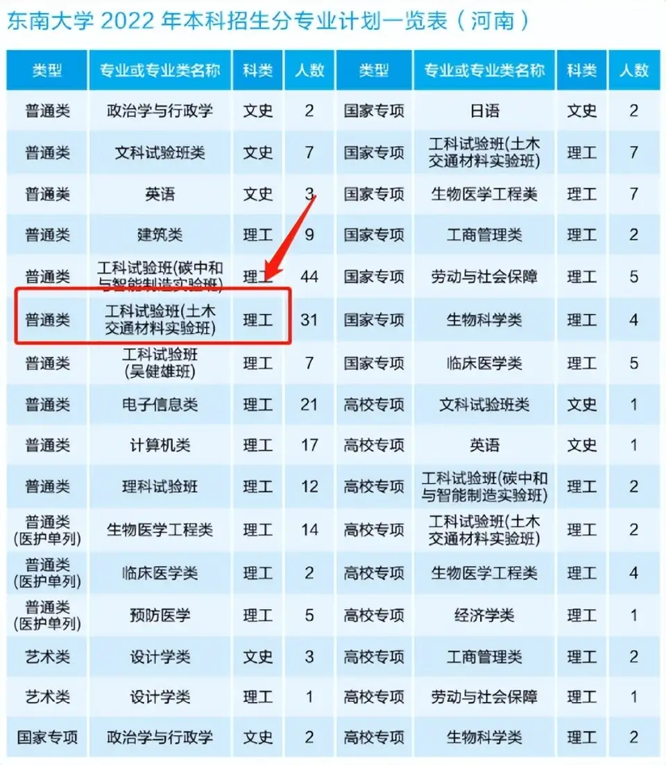 数据一:2022年东南大学在河南的招生计划