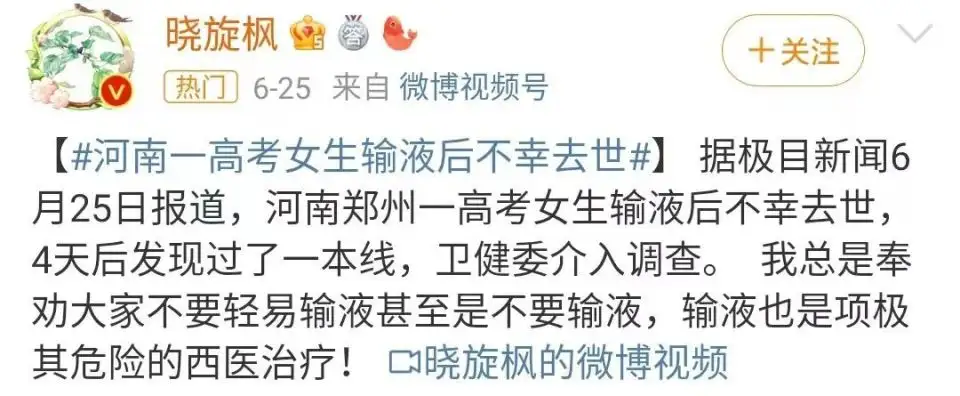 6月26日,一条“河南高考女生高考过了一本线,却因输液不幸离世”的新闻冲上了热搜,引起了网友的怜惜和讨论。