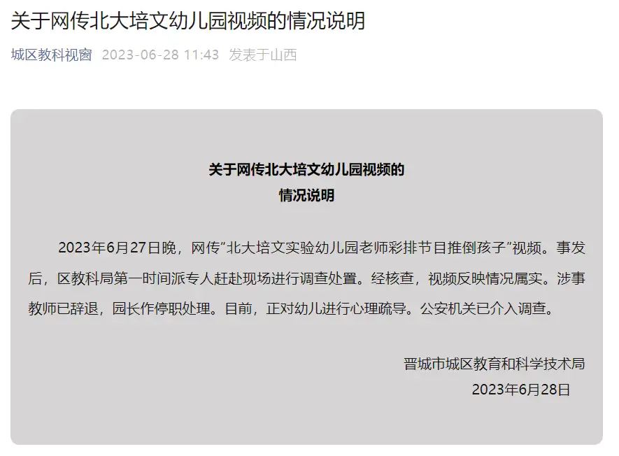 据城区教科视窗公众号:2023年6月27日晚,网传“北大培文实验幼儿园老师彩排节目推倒孩子”视频。事发后,区教科局第一时间派专人赶赴现场进行调查处置。经核查,视频反映情况属实。涉事教师已辞退,园长作停职处理。目前,正对幼儿进行心理疏导。公安机关已介入调查。
