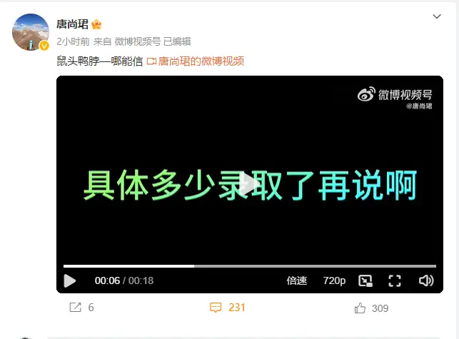 6月26日,唐尚珺发布18秒视频辟谣称,“网传564分或664分都是谣言,具体成绩多少,等录取了再说。先搬砖赚点学费,总之,梦想之路漫漫。”
