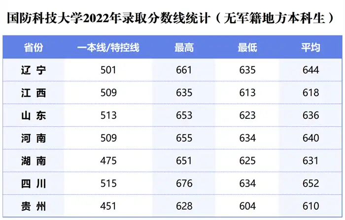 国防科技大学2022年无军籍地方本科生在各省份录取分数