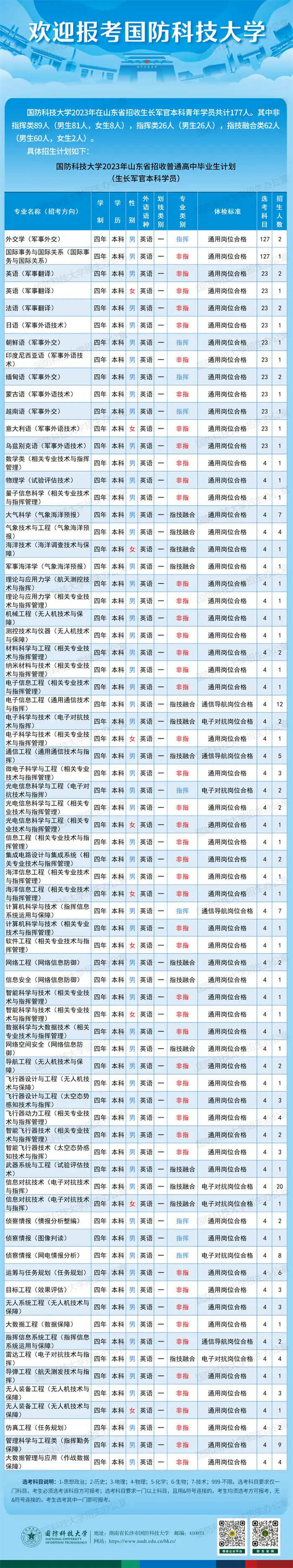 此外,国防科技大学2023年在全国31个省份(市、自治区)面向普通高中毕业生招收2600名生长军官本科学员。其中:男生2441人,女生159人;理科2369人,文科231人。2023年在山东省招收生长军官本科青年学员177人,其中非指挥类89人(男生81人,女生8人),指挥类26人(男生26人),指技融合类62人(男生60人,女生2人)。应届毕业生和往届毕业生均可报考。要求考生年龄在17周岁以上、20周岁以下(截至报考当年8月31日);政治考核合格,志愿为国防事业服务;身体和心理健康,符合军队选拔军官和文职人员体检标准;高考文化成绩在当地一本线以上。