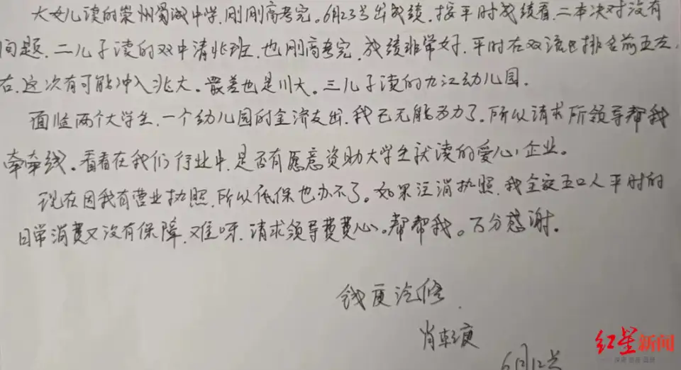 高考结束后,思虑再三的肖乾庚手写了求助信,思来想去,却没有渠道可以发出去,只能请病友帮忙转发,希望能引起关注,找到能资助孩子上学的途径。“靠我们自己,只能保证家里‘米缸有米’,但两个孩子上学是大事。”