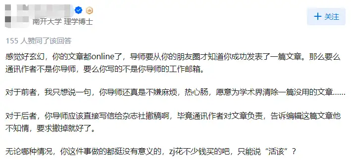 知乎一名研究生提问:自己一篇文章online了,发朋友圈嘚瑟了一天,结果让导师看见了,直接让他撤稿。导师说写得太好了,怀疑不是自己写的,我该怎么办?如果撤稿,中介费肯定是要不回来了,那版面费还要的回来吗?撤稿对我以后发论文有什么影响?求指点......