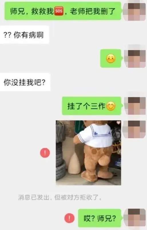 研究生再回复发现已被老师拉黑,因此截图聊天记录,向师兄求助,结果师兄满脸问号,谨慎地问了一句“你没挂我吧?”,该生回答到“挂了个三作”,只见表情包还没来得及发出,就又被拉黑了