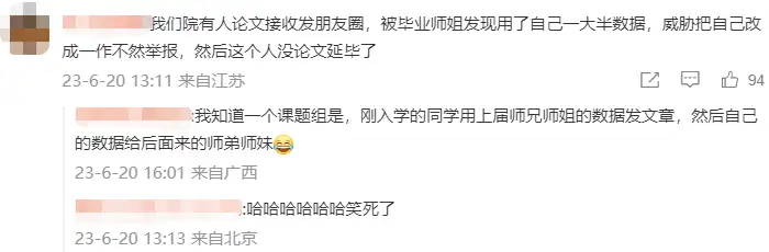 另有网友补刀:现在的学生们在搞一种很“新”的学术“传承”,“刚入学的同学用上届师兄师姐的数据发文章,然后自己的数据给后面来的师弟师妹”。