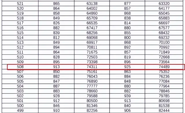 参照2023年湖南高考成绩一分一档表来查询的话,508分的成绩恰好在文理都在74000名左右,按照录取比例来划分的话,说实话这个成绩只能在一本线内的大学里选择一个中游的。