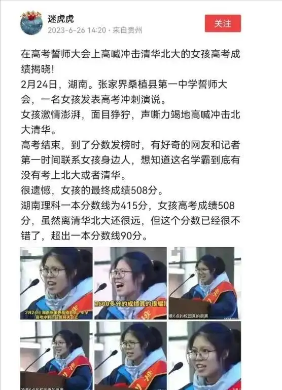 尴尬?湖南“狰狞”誓师女孩被曝508分,排名7万开外,211都没戏