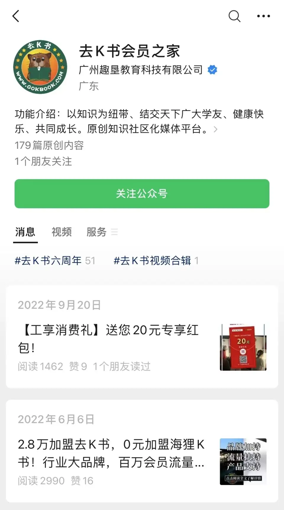 从“去K书”微信公众号“去K书会员之家”登记的信息来看,该品牌背后运营方是广州趣垦教育科技有限公司,记者前往该企业的工商注册所在地,同样也找不到该企业身影,其所在办公大厦的物管中心及场所出租方工作人员均透露,该企业的“消失”很突然,目前仍拖欠物业费及租金。