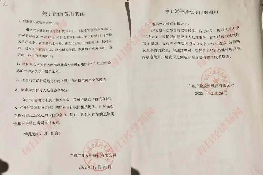 上述工作人员还向记者展示了业主单位此前向“去K书”发出的追缴租金函、终止出租函等,这些函件落款时间为2022年12月29日,其中记录信息包括“去K书”长期无法取得联系,现场无实际管理人处理事务被暂停水电,拖欠2022年1月至12月房屋租金、管理费及水电费。