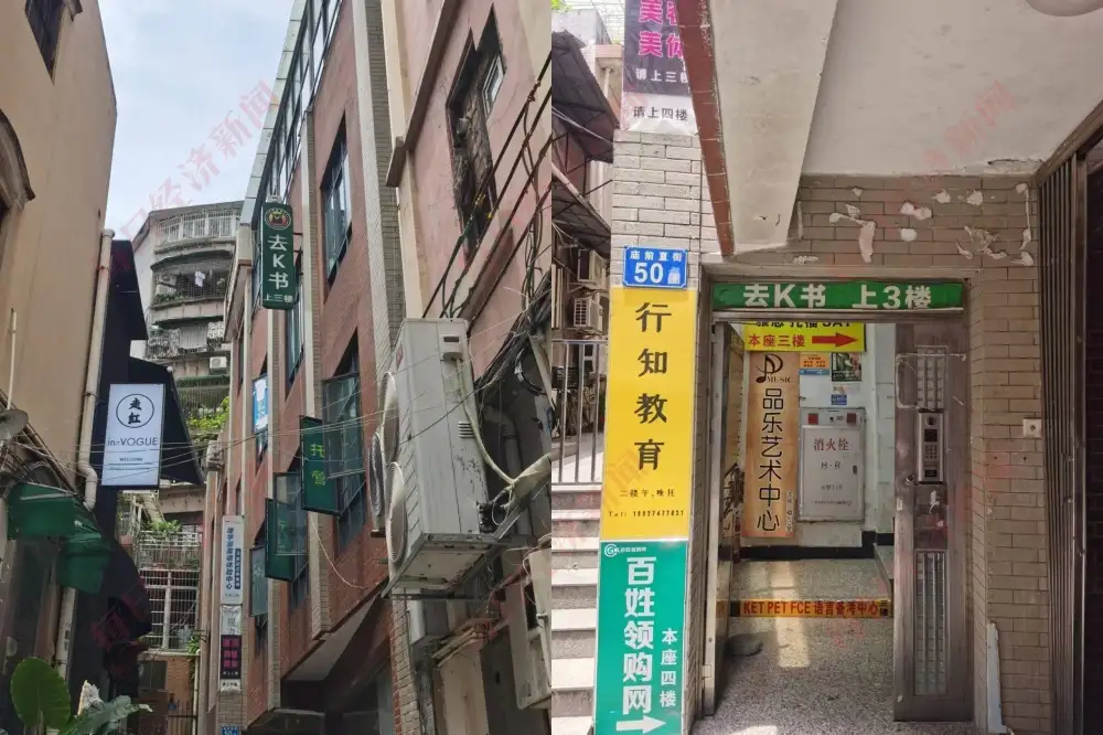 广州首家“去K书”所在大楼底层及楼体外墙上,仍挂有“去K书”的招牌,但实际经营地址(3楼301)目前已变更为一家教育培训机构,找不到任何与“去K书”或是付费自习室有关的痕迹。记者在此遇上了一名从该机构出来的工作人员,他确认“去K书”已不在,“没了,今年初搬走了”。
