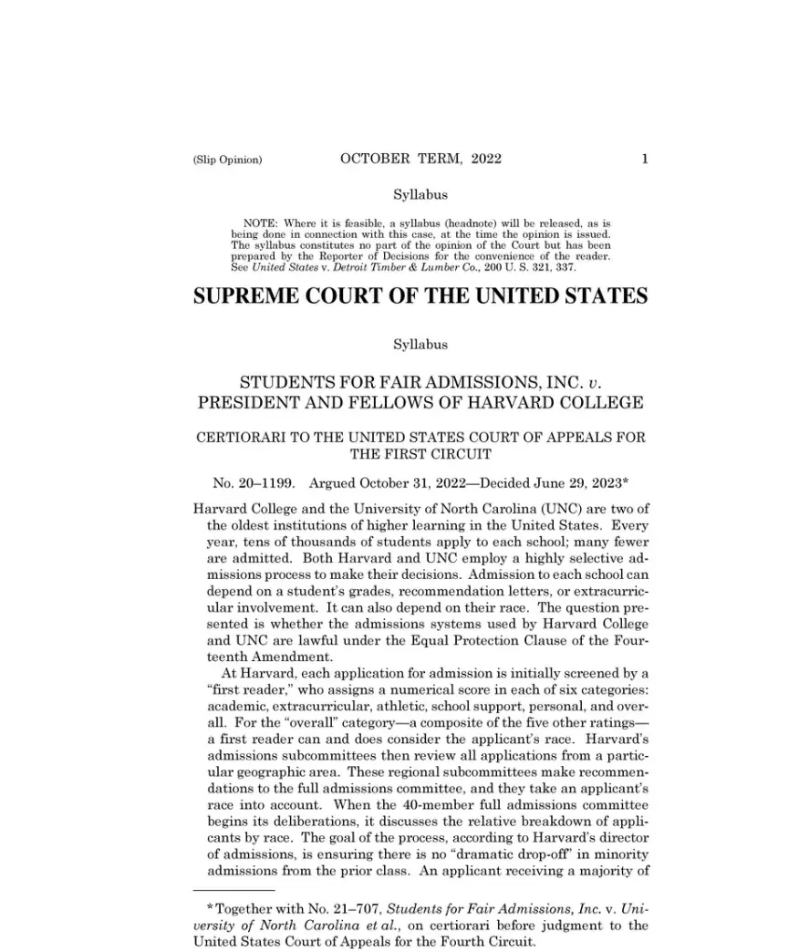 罗伯茨法官作为代表撰写了多数方意见。他写道:“哈佛大学和北卡罗来纳大学的平权招生项目,不可避免地以消极的方式利用种族,并且缺乏有意义的目的。我们从来没有允许招生计划以这种方式运作,今天也不会这样做。大学的这项政策违反了宪法第十四修正案的平等保护条款。”
