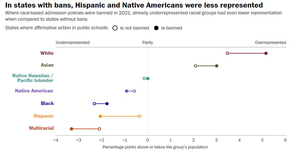 事实上,与堕胎权一样,美国目前已经有部分州禁止学校依据种族进行招生。根据《华盛顿邮报》的统计,在2021年后9个禁止平权政策的州中,白人和亚裔在公立学校中被录取的比例会进一步提升,而拉美裔、混血儿和原住民被录取的比例会下降。
