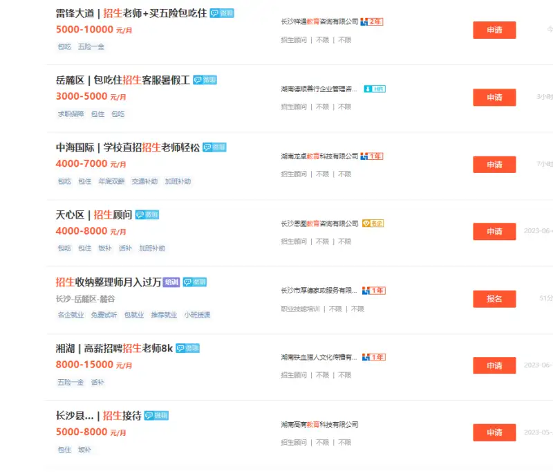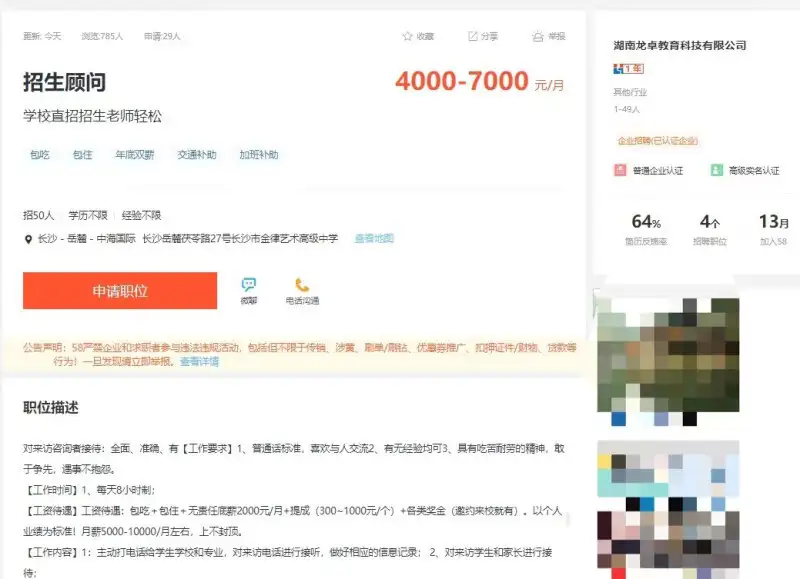 6月25日,记者在某同城分类信息网站上搜索发现,有大量近期发布的招聘“招生顾问”“招生老师”信息。这些招聘信息的发布方多为教育科技公司、教育咨询公司,但工作内容是为某个民办高中或中职学校、技工学校进行招生,有的招聘页面写着:“通过电话或微信和学生或家长沟通,向他们介绍学校情况,邀约来校参观咨询。”
