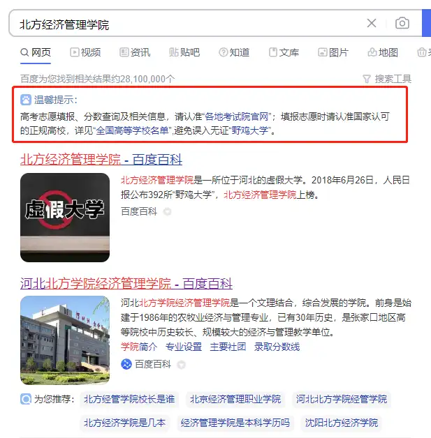 记者在搜索引擎搜索这些“野鸡大学”时还会出现“该校是一所位于河北的虚假大学”等相关提示。