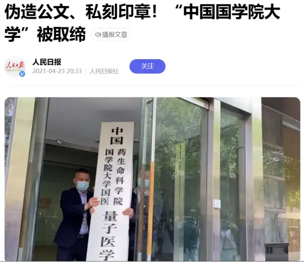 例如,2021年,北京市民政局依法对非法社会组织“中国国学院大学”及下设的“中国国学院大学国医药生命科学院”“中国国学院大学国医药生命科学院量子医学研究院”等70家分支机构予以取缔。至此,这个招摇撞骗多年的非法社会组织终于“土崩瓦解”。