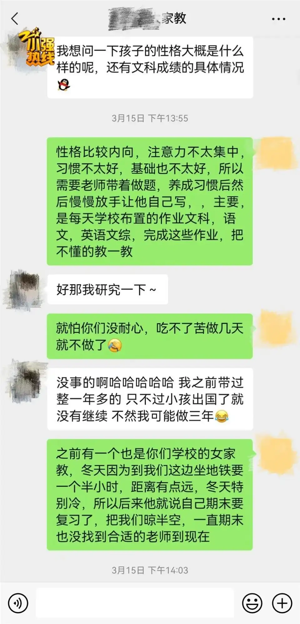 冯女士强调,她当初说孩子基础比较薄弱,要求家教带着他一题一题做。对此,小黄表示,她刚开始也这样尝试过:“我一题一题讲给他听,他只会让我报答案,非常依赖我,这就是我们两个教育理念的问题。”