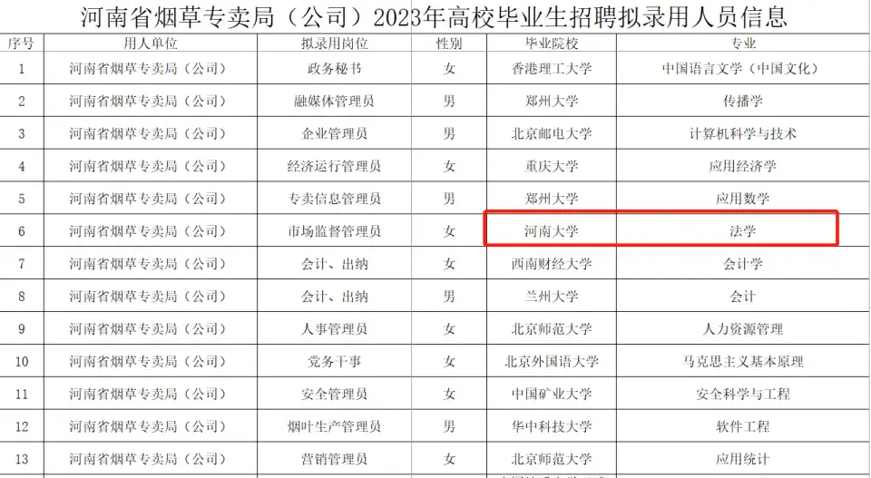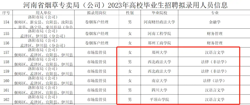 虽然河南地级市下属的区局和县局大部分岗位都是普通院校毕业生,但是也不乏部分985、211的名校毕业生,比如有一个岗位招录了6人,其中有南京大学、四川大学和郑州大学的毕业生,录取西北政法大学的也是法学这样的王牌专业毕业生,高考录取分数线比部分211高校分数线只高不低,因此这个岗位可谓是名校云集啊!如此多名校生扎堆这个岗位主要还是这个岗位是可以分配到洛阳市城区的分局,不用去县局的!