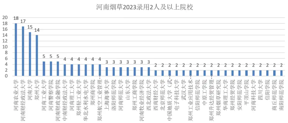 其中最引人瞩目的就是本省的河南农业大学,录取人数直接达到了19人排在首位,表现着实亮眼,一方面河南农业大学烟草等相关专业的毕业生对河南烟草来说绝对是非常对口了,另一方面很多河南农业大学毕业生都选择偏远一点的地级市以及地级市下属县局来提高自身的上岸概率,毕竟大部分名校毕业生都去报考省局以及郑州市局了,偏远地级市的竞争激烈程度要低很多!