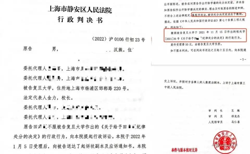 2022年7月5日,上海市静安区人民法院作出了撤销复旦大学于2021年11月15日作出的校处字(2021)36号《关于给予田某(即小田)纪律处分的决定》的行政行为的判决。