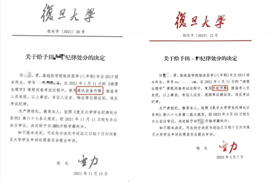 在二审判决生效后不久,小田再次被复旦大学开除。据2023年4月7日,复旦大学出具的纪律处分决定显示,因小田在闭卷考试过程中,使用手机作弊,被监考人员发现,依据相关规定,决定给予小田开除学籍处分。上游新闻记者对比两份处分决定发现,第二份决定除将“通信设备”改为“手机”外,其余内容并无差别。