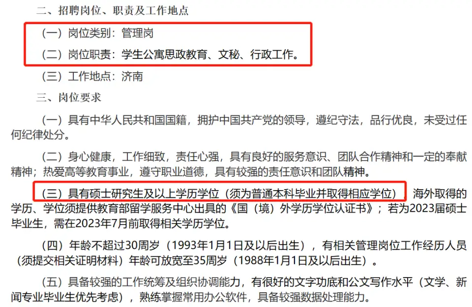其实事实绝对不是很多网友想的那样,这个岗位绝对不是什么一线宿管岗位,因为根据《山东大学学生公寓管理服务中心非事业编制人员招聘公告》来看,这次招录的两人要求至少是硕士及以上,不过招聘岗位是管理岗位,岗位工作内容也是学生公寓思政教育、文秘、行政工作,绝对不是宿管岗位,而是管理宿舍和宿管的行政人员!