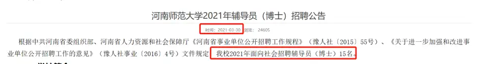 如果说武汉大学这样的名校可以理解的话,那么2021年河南师范大学招聘辅导员就要求是博士毕业生了,确实有越来越多的高校行政岗位要求是博士了,至于专任教师则开始卷博士的论文数量了,确实现在博士也越来越多了!