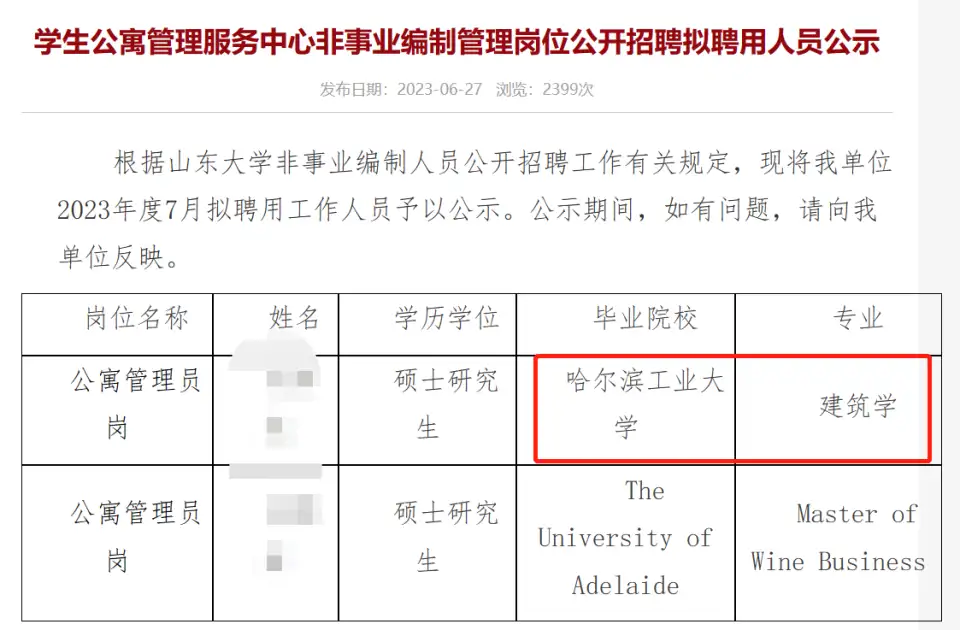 山东大学学生公寓管理服务中心公布了公开招聘非事业编制管理岗位聘用公示,其中公寓管理员岗位招录的2人分别来自哈尔滨工业大学建筑学硕士和一名国外高校硕士,这令不少网友震惊了,哈工大建筑学硕士居然去当宿管!然而却并非如此,这次招录的公寓管理岗不是宿管,而是做学生公寓思政教育、文秘、行政工作!