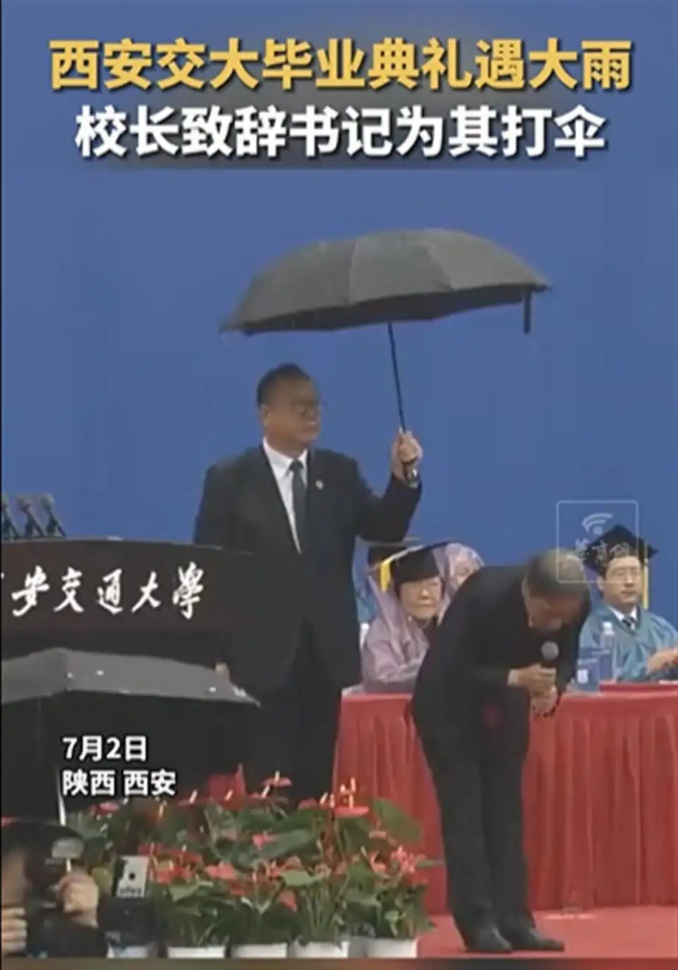 7月2日上午,西安交大校长王树国在2023届研究生毕业典礼致辞时,因天降大雨,党委书记卢建军上前为他撑伞挡雨,这一幕引来网友感慨,认为学校的两位“一把手”关系如此和谐,令人暖心,也是学校之福。
