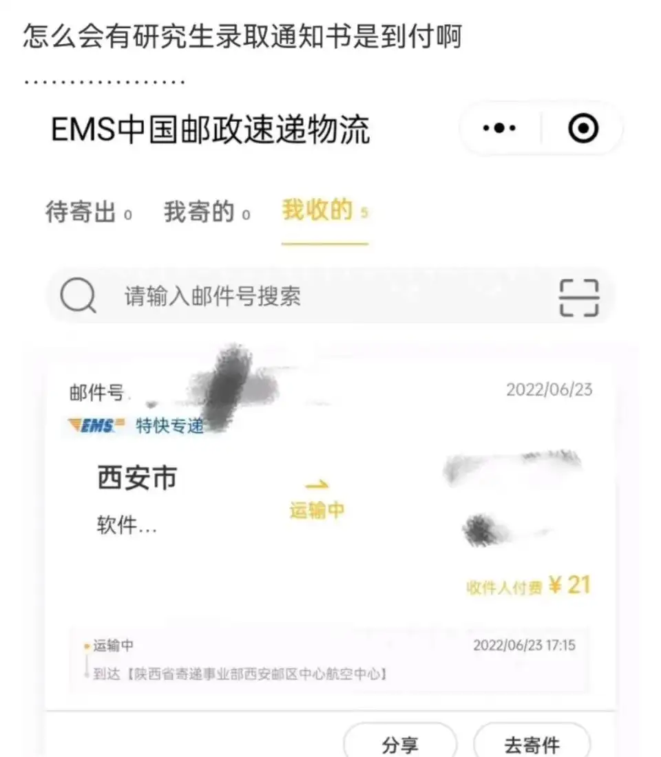 讲真,淘宝还包邮呢!偌大一个学校发录取通知书,咋不给垫付一下邮费呢?(这里不好一一点名,川大、西交软自己认哈~)