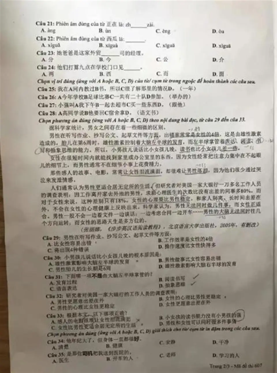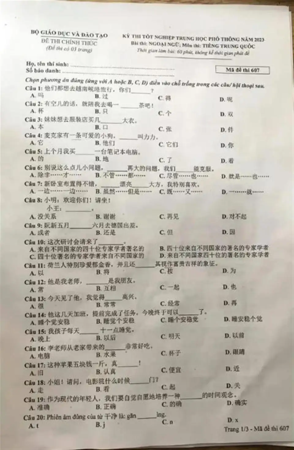 越南高考中文试题(图源:社交媒体)