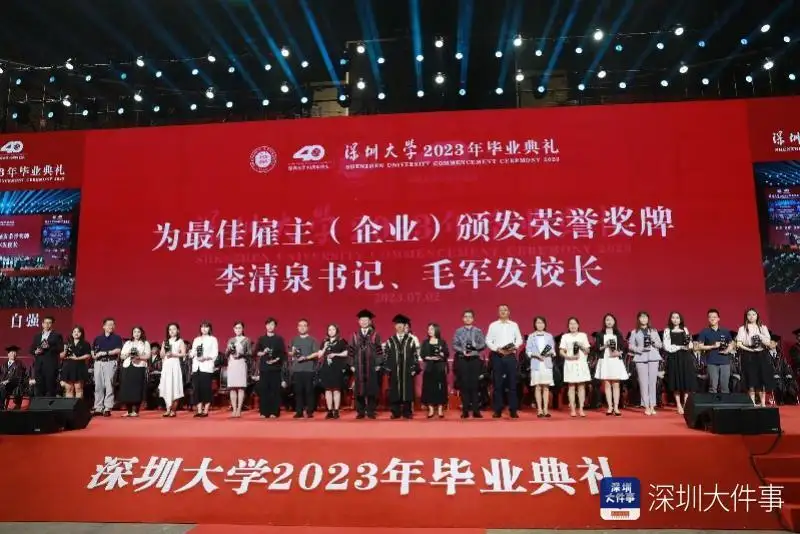 当天典礼活动中,为感谢长期以来吸纳、认可、支持深大毕业生,为深大学子提供高层次干事创业平台的雇主单位,根据近5年接收深大毕业生人数情况,深圳大学授予华为技术有限公司、比亚迪股份有限公司、腾讯科技(深圳)有限公司、中兴通讯股份有限公司、华润(集团)有限公司、中国建设银行股份有限公司深圳市分行等40家单位“深圳大学大学生最佳雇主(企业)”荣誉称号,并颁授荣誉奖牌。