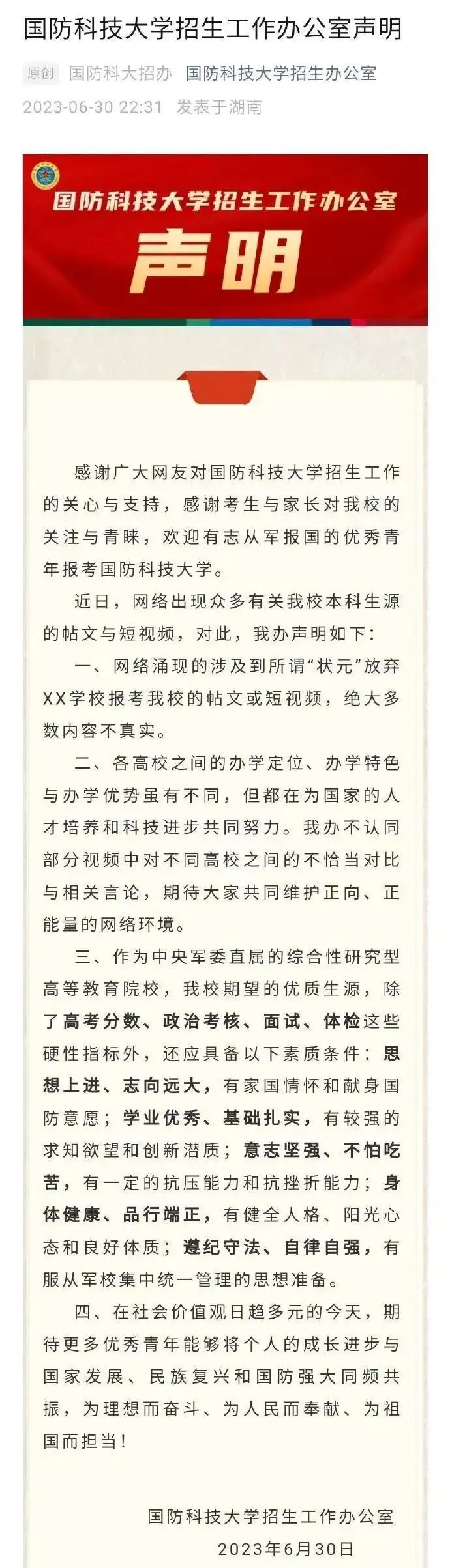 6月30日,国防科大招生工作办发表声明,批驳这些营销号视频“绝大多数内容不实”,表示“不认同部分视频中对不同高校之间的不恰当对比与相关言论”。