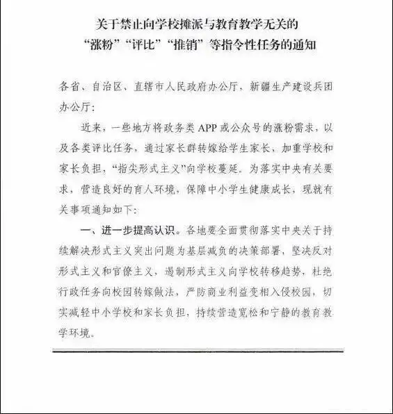 2022年,国务院教育督导委员会办公室发布《关于禁止向学校摊派与教育教学无关的“涨粉”“评比”“推销”等指令性任务的通知》,要求各地遏制形式主义向学校转移趋势,杜绝行政任务向校园转嫁做法。