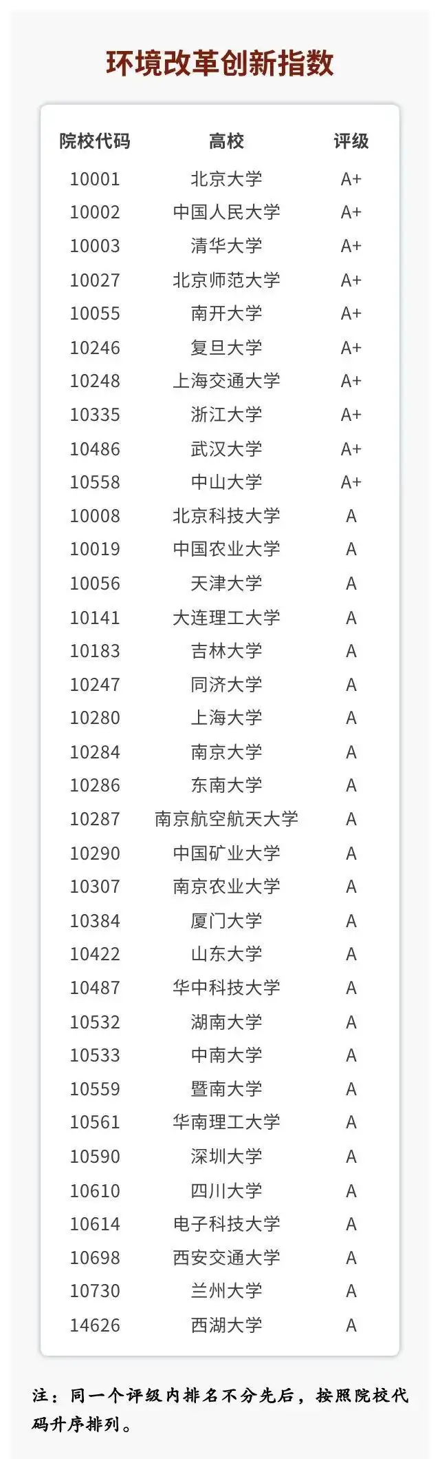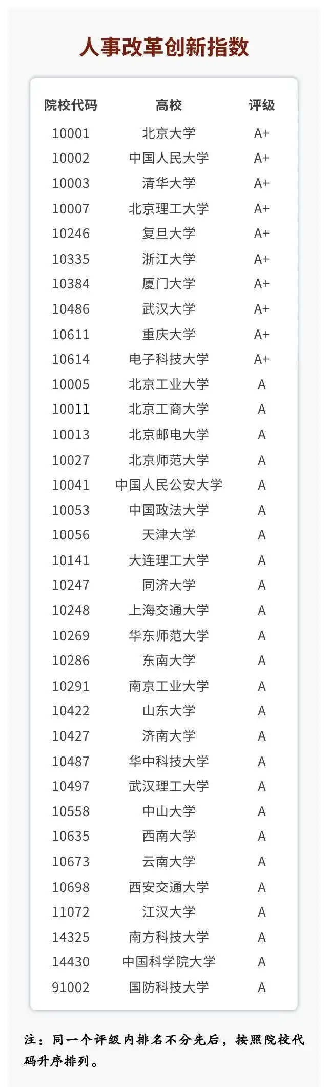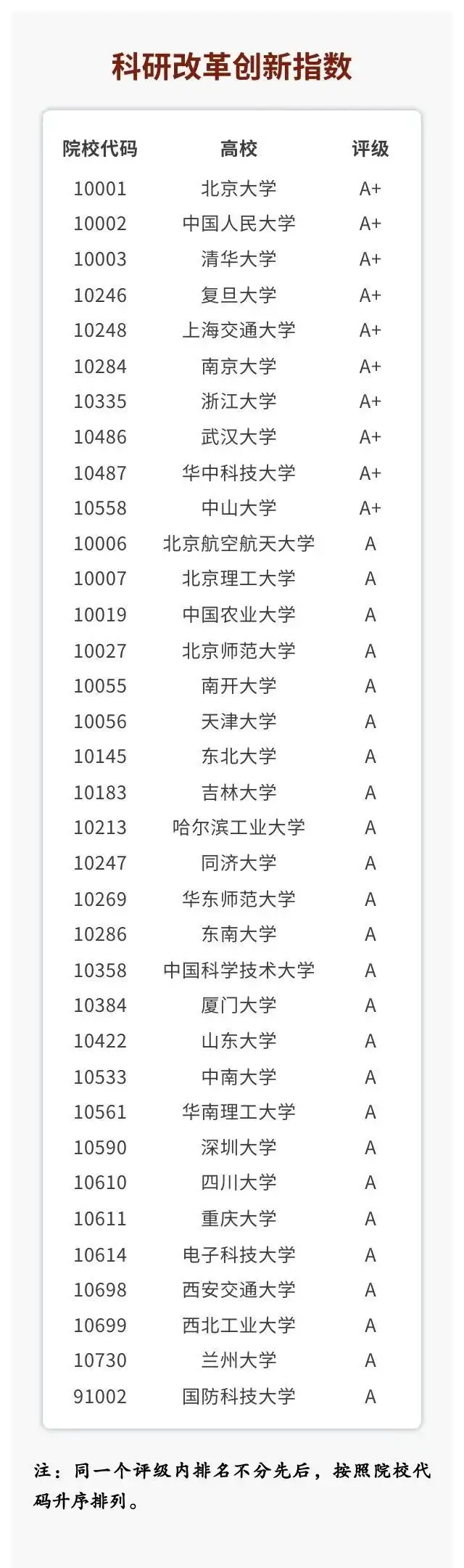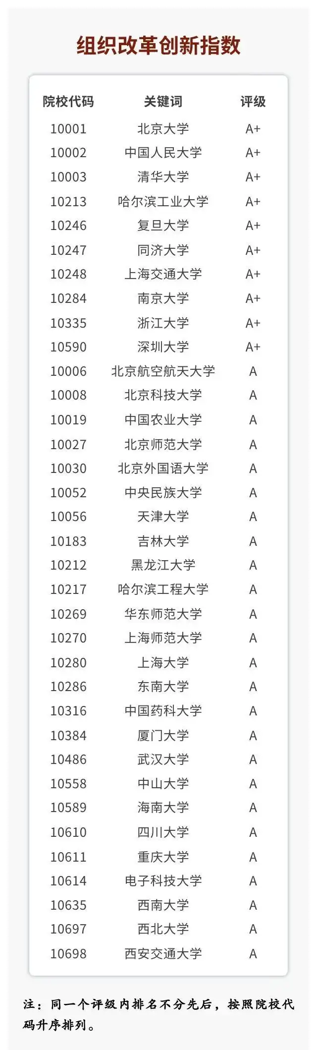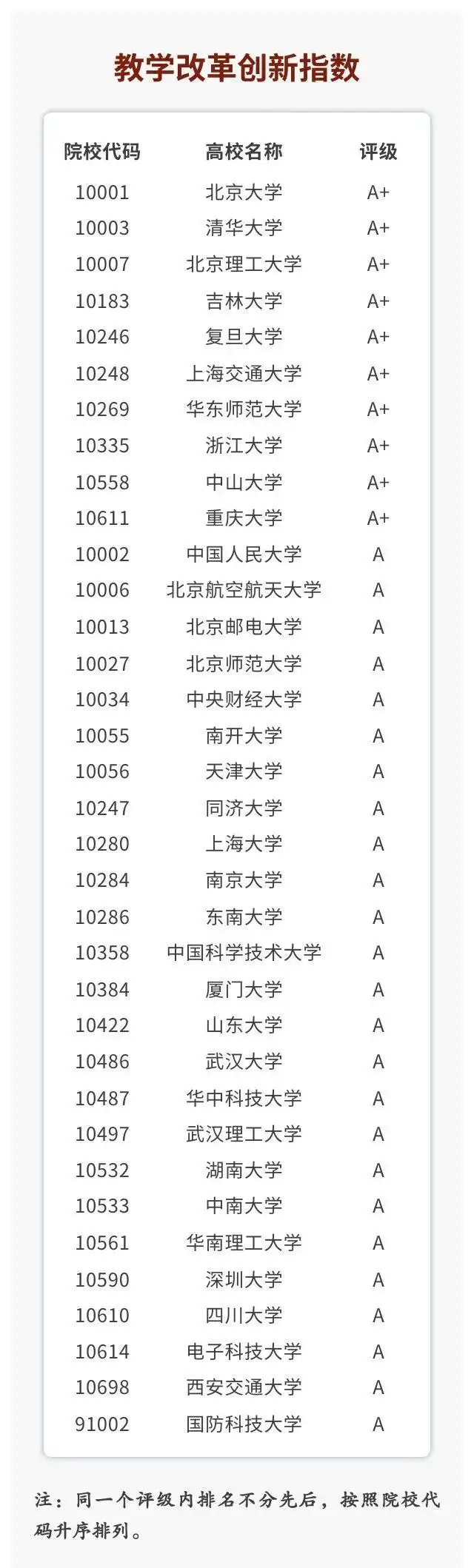 2024年1月5日,在中国人民大学举办的“2023年中国大学改革创新指数发布会暨研讨会”上,全国高校信息资料研究会和中国人民大学评价研究中心联合研制的“2023年中国大学改革创新指数”正式发布。指数结果显示,2023年有十所高校在改革创新方面表现亮眼,改革创新评级为A+。这十所高校包括北京大学、中国人民大学、清华大学、复旦大学、同济大学、上海交通大学、浙江大学、武汉大学、重庆大学和电子科技大学(排名不分先后)。