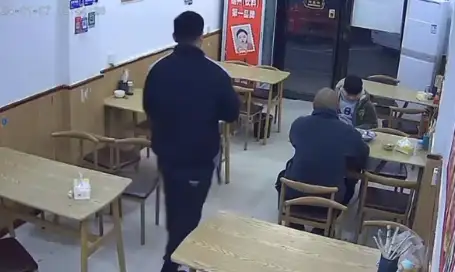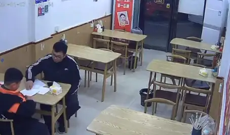 店内监控显示,梅女士的儿子当时也在吃东西,桌上摆着作业,旁边另外一桌的男子吃完饭后,先是将碗筷收好,之后并没有离开,而是坐到小男孩对面,辅导其作业。