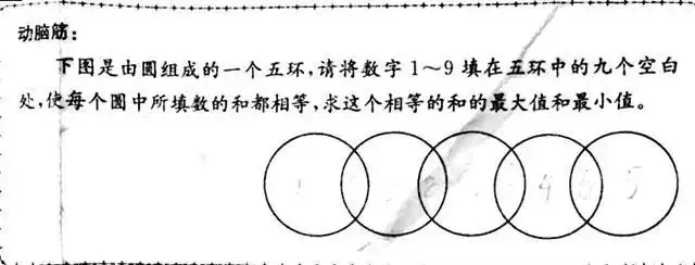 动脑筋:下图是由圆组成的一个五环,请将数字1-9填在五环中的九个空白处,是每个圆中所填数的和都相等,求这个相等的和的最大值和最小值。