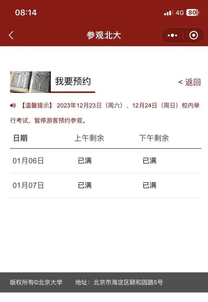 1月2日8时14分,小长假后上班第一天,记者打开“参观北大”申请预约,预约页面显示,1月6日、7日上、下午都“已约满”。